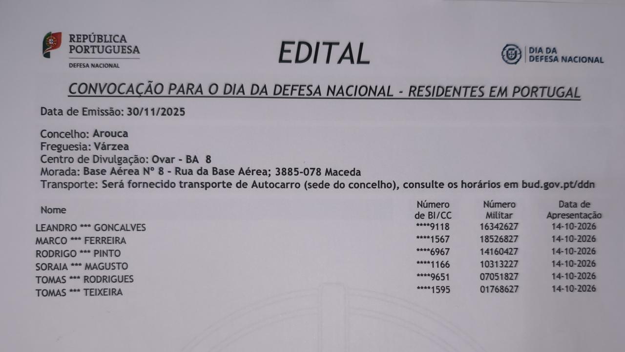 Edital dos convocados da freguesia de Várzea - 14/10/2026 Base Aérea Nº8 Ovar